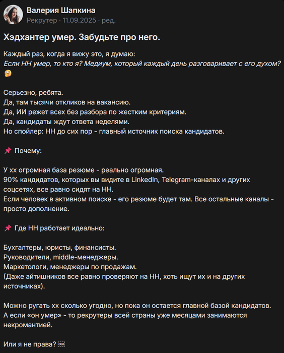 Тут интересная логика у дамы. Она исходит из того, что она занята делом и вообще полезна. Это её аксиома. Далее следует логическое следствие, что если хх умер, то рекрутёры занимаются некромантией. Но я же не такая :) При этом пост написан с помощью AI почти наверняка. Т.е. мы наблюдаем мёртвых HR-некромантов которые ходят по кладбищу вакансий чтобы в мёртвых AI-резюме найти хоть чуточки жизни... бррррр.... облить безнином обоссать и сжечь. или сначала сжечь а потом обоссать.