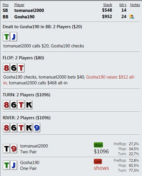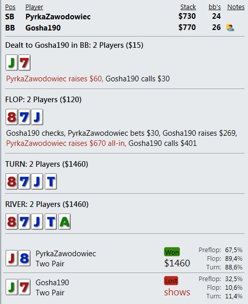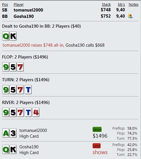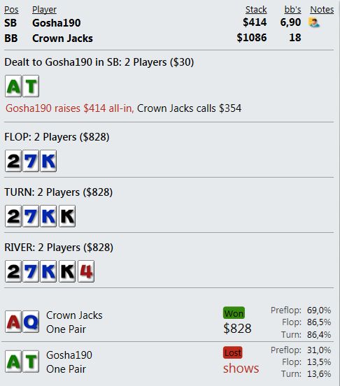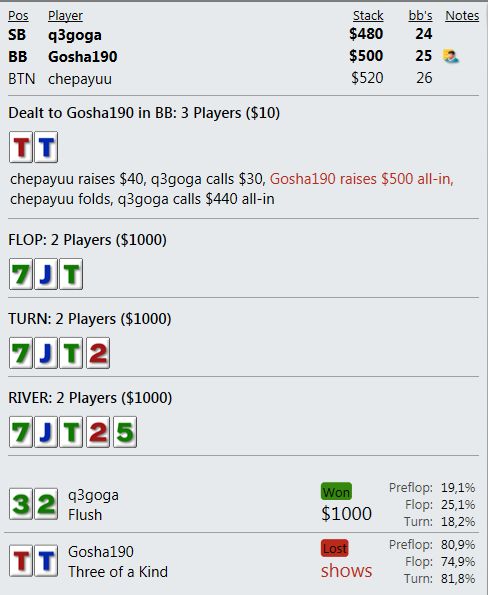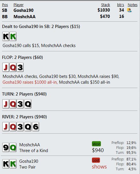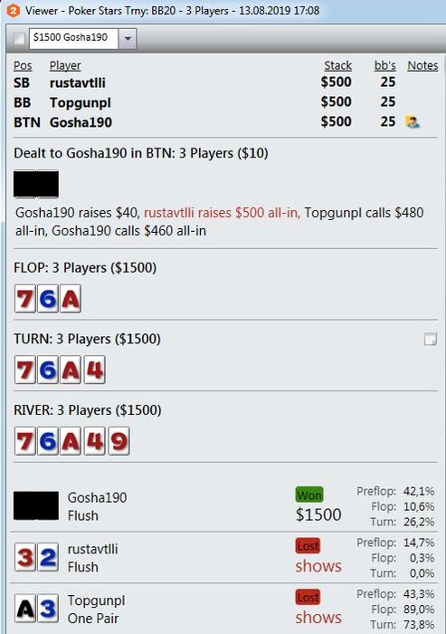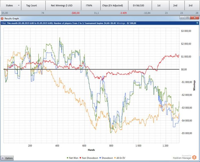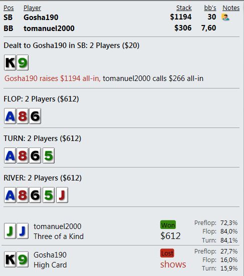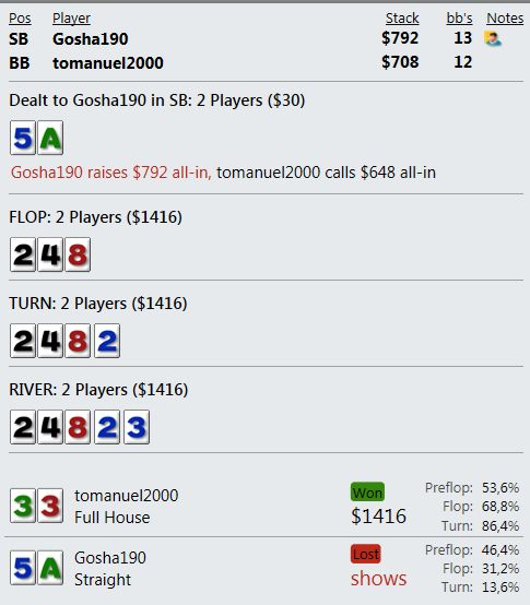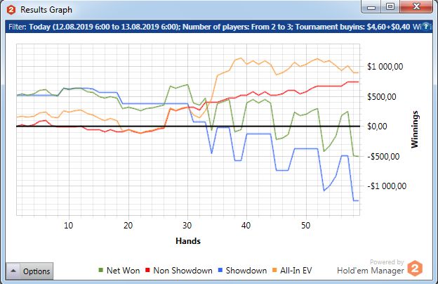 Играю мало, что играть, если сдают так, что я всегда сливаю? Причем по ЕВ лью даже больше, чем по деньгам. Куча дебилов и все в год моде против меня. Непрерывно упираюсь в натсы. Если мне нечем играть и в стеках меньше 10бб я наконец получу руки типа А8, то опп покажет JJ+.