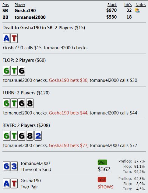 Сдают по прежнему: - немец играет 100% рейз в ХА. 3 бет пушу в него 44, немец показывает 77. - в глубоких стеках оупен пушу с кнопки 88 в двух идиотов. СБ колет этот пуш с А6о - на флопе конечно туз. - и т.д. по аналогии