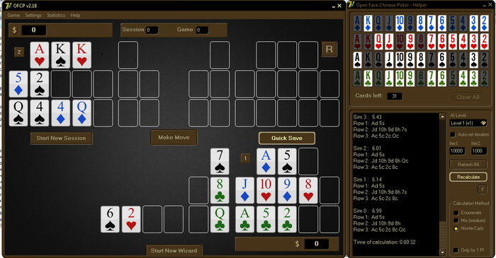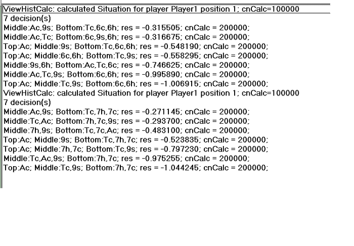 Стал проверять его и мои результаты с конца. Считал за всех все возможные конечные 13-карт расклады. И сравнивал их. На самом деле конечных вариантов не так и много. Можно легко сравнить.