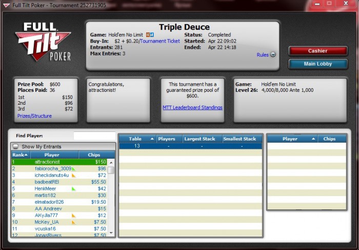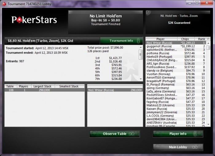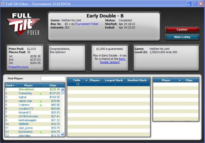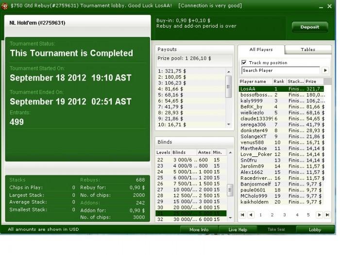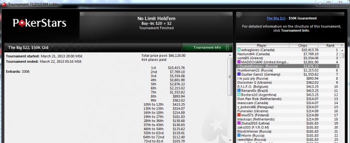 PokerStars Турнир №524711492, Безлимитный Холдем Фриролл 10000 игроков(а) Бонус к призовому фонду от PokerStars: $48.60 USD Общий призовой фонд: $100.00 USD Турнир начался 18.03.2012 8:00:00 ВВ