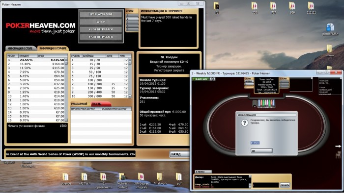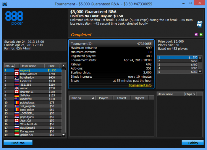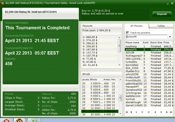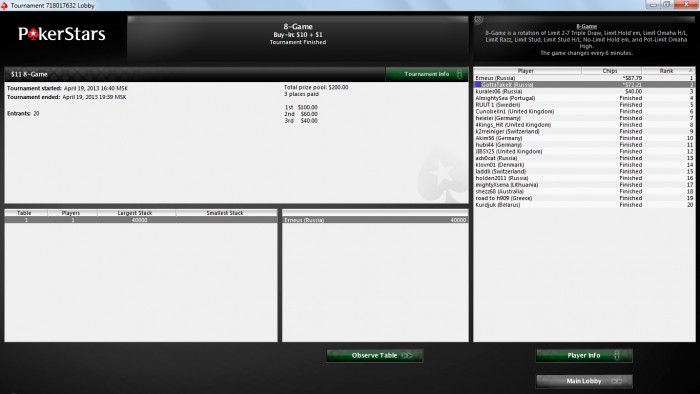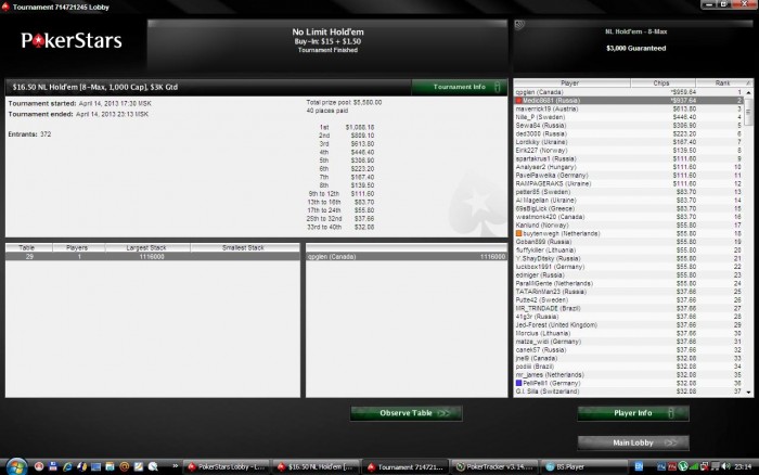 PokerStars Турнир №718017943, Безлимитный Холдем Бай-ин: $5.00/$5.00/$0.50 USD 256 игроков(а) Общий призовой фонд: $2560.00 USD Турнир начался 20.04.2013 21:15:00 MSK [20.04.2013 13:15:00 ВВ]