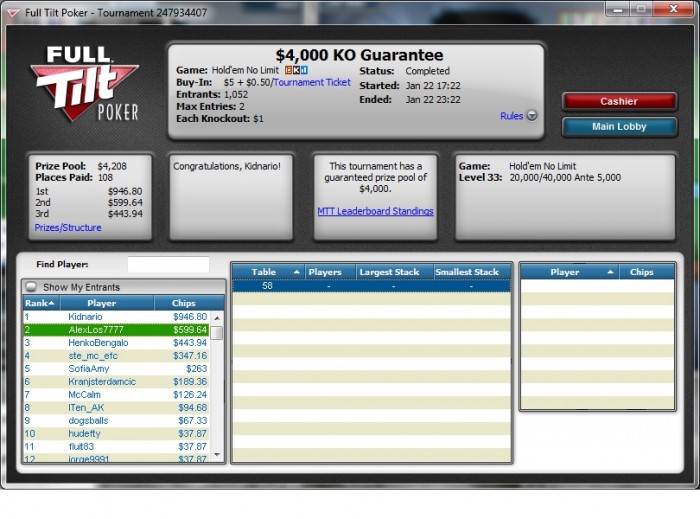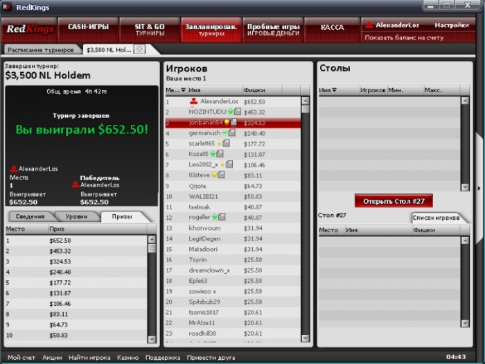 В этом турнире Вы также получили награду в размере USD 45,00 за то, что выбили других игроков. Вы получили награды за то, что выбили следующих игроков: SamsagaZzZ, Doc_G1, here2rape, Krowi1, SleightOfJam, Kompre$$or, RoninFF, GAZDAPAJA, qwer_nn27 Примечание. Поскольку Вы выиграли турнир, то также получаете награду, назначенную за Ваш вылет.