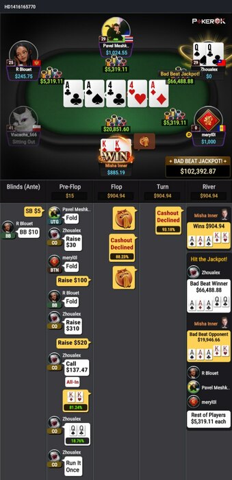 Реги на нл1к молятся на джекпот. А тут азиат по фану с 500ми баксами сел. Был тоже один азиат на AoF Omaha за примерно 500 рук два джекпота поймал в сумме более 100к. RR999 ник вроде.