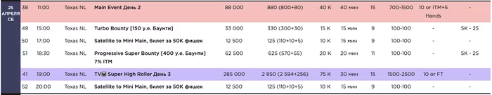 Обратите внимание на крайнюю правую колонку в таблице расписания. В ней указано, в каких турнирах со старта можно взять добавку к стеку "за чай": за 25-50 у.е. чаевых персоналу во многих турнирах можно получить дополнительные 5,000 фишек к стеку.