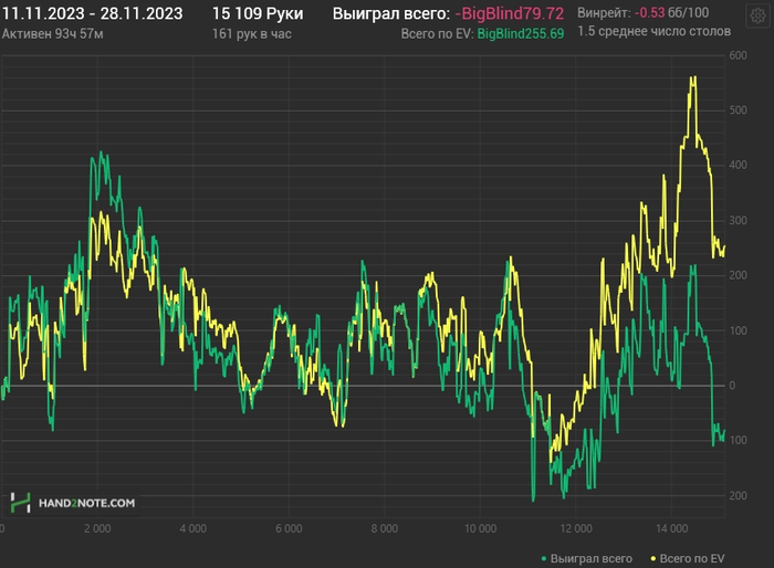 Привет. Где-то с августа по ноябрь у меня действительно сильно снизился фокус на развитии своей игры, просто жизнь вне покера была значительно интереснее, ну я её и жил. За несколько лет ноулайфа накопилась сильная потребность в живом общении со всеми вытекающими, да и с деньгами стало получше. Это очень яркое и крутое время, ни разу не жалею, что не стал сдерживать себя и запираться в четырёх стенах, только чтобы заработать побольше денег