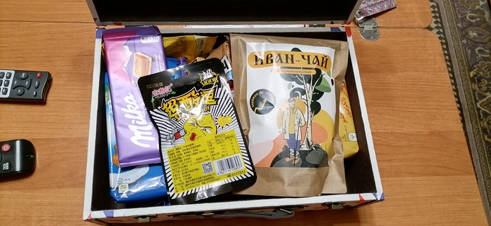 А внутри него куча сладостей: печеньки, конфеты, шоколадки ещё пакет с иван-чаем и даже пакетик с покерными фишками от Gipsyteam
