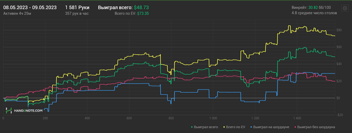 Столы всё ещё сок, но я уже потерял концентрацию, решил закончить. Сегодня 9 мая, в казино катушка должна быть хорошая, поеду на кеш ближе к вечеру, скорее всего.