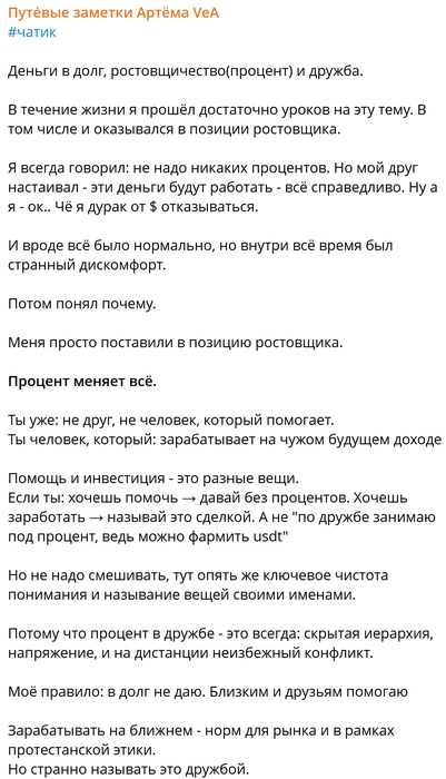 Добавлю ещё, 1. вся бы эта ситуация вообще не могла бы случится - если бы не растовщичество. Подробней в следующем сообщение. 2. В моём понимание если ты занял/помог/дал денег другу. То ДРУГ сам отлично понимает, что ему оказана услуга. И при возврате проставится/накинет сверху если будет возможность. А нет, так значит ему нужнее.