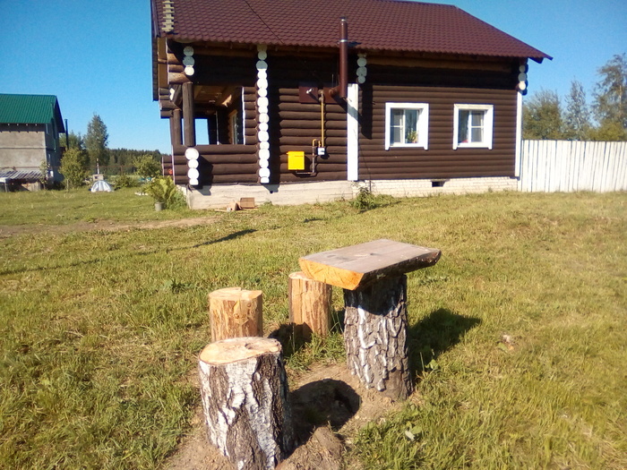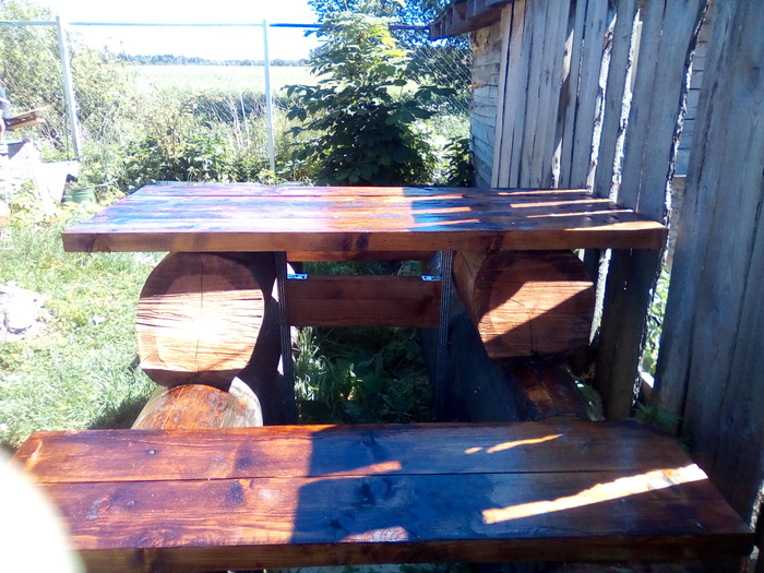 Из обрезков бревен и досок соорудил я скамейки со столом в тенистом закутке недалеко от бани. Чтобы пиво пить. Сооружение получилось жутко красивое (фотографией не передать) и такое же жутко неудобное. Залезать в эту конструкцию заебешься. Зато на заднем фоне виден молодой каштан. Растет, как на дрожжах. Скоро буду отдыхать в его тени.