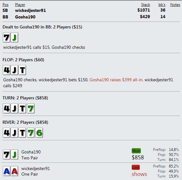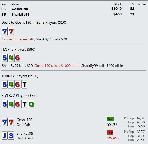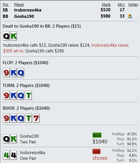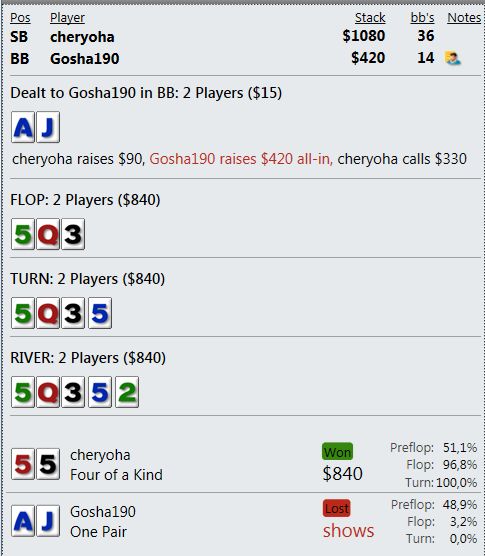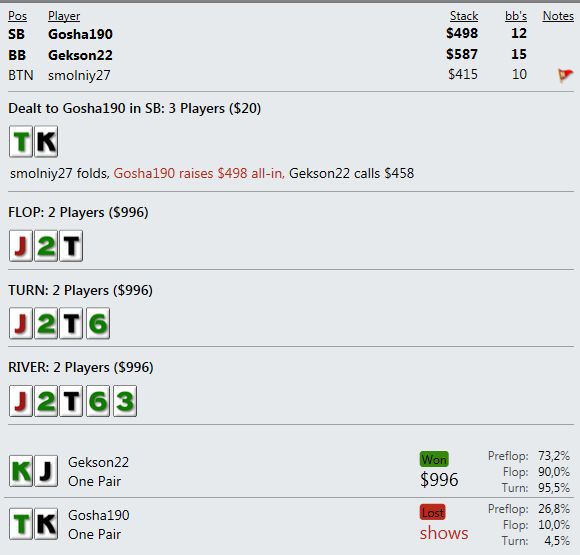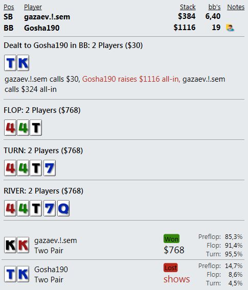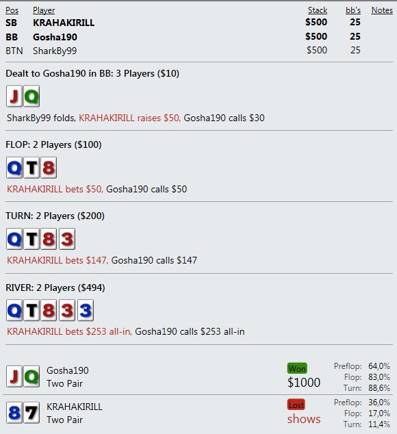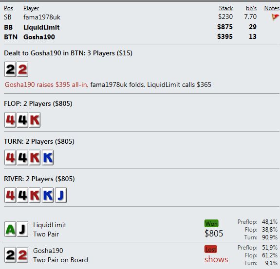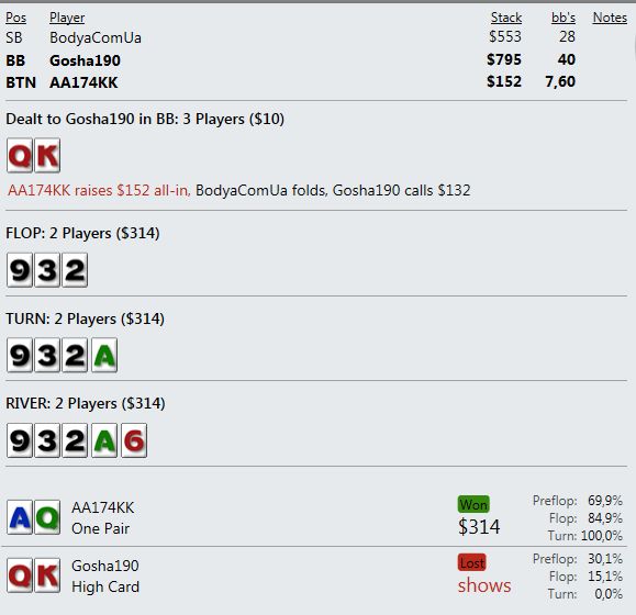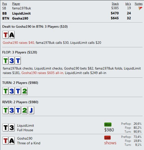И играют реально тупо ( как мне кажется - но я же фиш). Вот пример, где на прямой пуш я бы выкинул, но как сыграно решил что выкидывать уже нельзя, тем более опп явно фиш. В принципе был готов увидеть QQ+, а его рука привела в недоумение.
