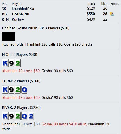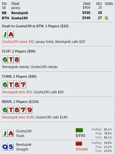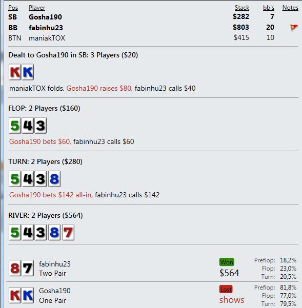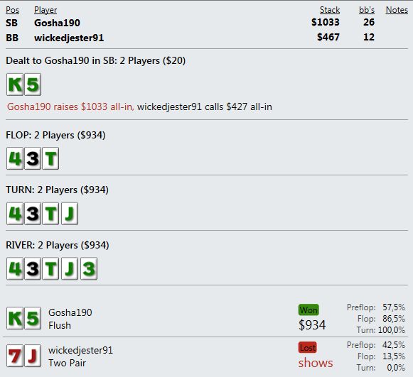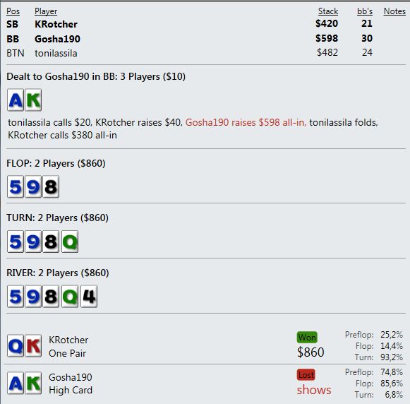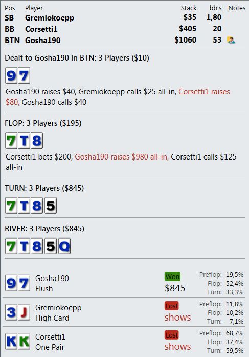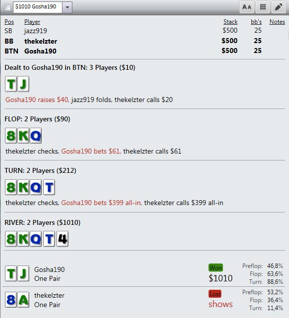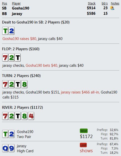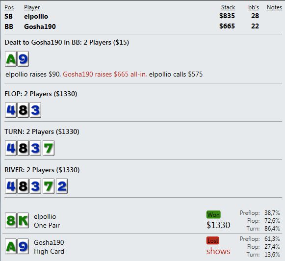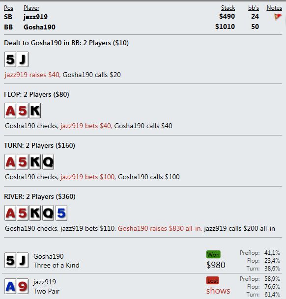 И играют реально тупо ( как мне кажется - но я же фиш). Вот пример, где на прямой пуш я бы выкинул, но как сыграно решил что выкидывать уже нельзя, тем более опп явно фиш. В принципе был готов увидеть QQ+, а его рука привела в недоумение.