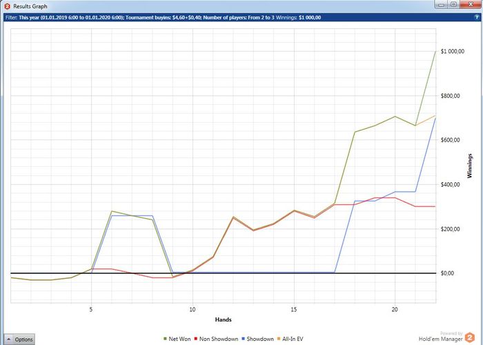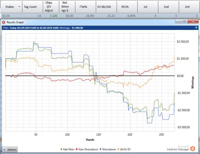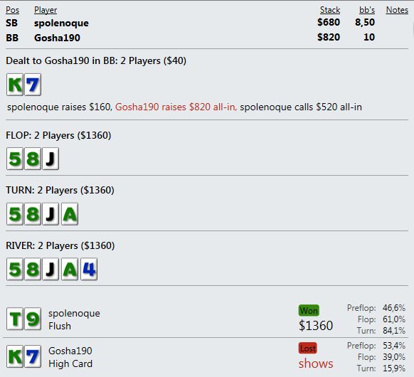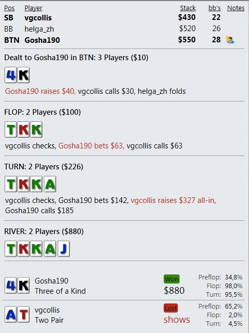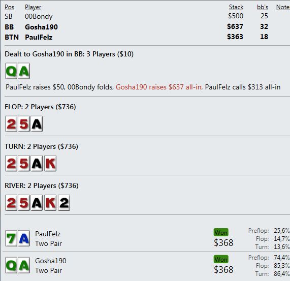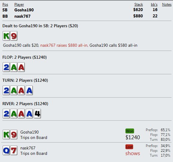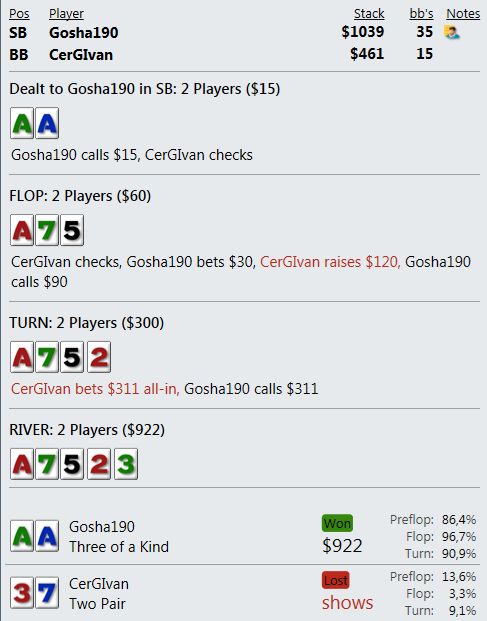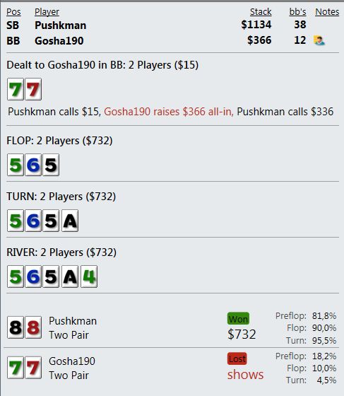 А когда от стека остается ничего, то абсолютно стандартное выставление в краманку старше - это просто неописуемо выводит из себя. Т.е. я вообще ничего не могу сделать - как ни играю, я всегда в проигрыше и по деньгам и по ЕВ.