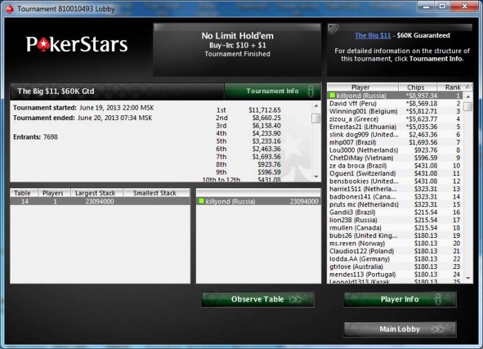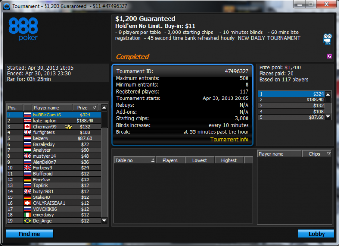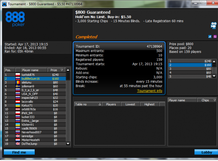 Tournament Info: $8.80 NL Hold'em, $8K Gtd