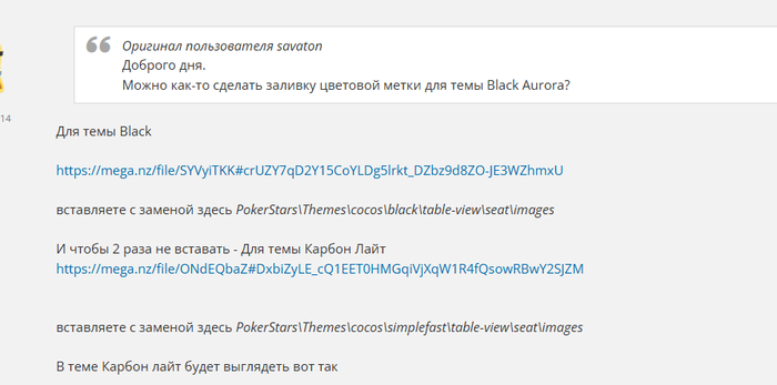 LikeAA, Я попробую эти файлы , подскажите в какую папку их закидывать , как написано выше в (C:\Program Files (x86)\PokerStars\Gx\table-view\seat\images) ? И для какой єто темы меркури?