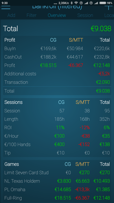 Статистические итоги по Розвадову: за ~40 дней: 352 часа чистой игры, +35€ в час; кеш: 185 часов, +100€ в час; турниры: 168 часов, -38€ в час. Больше 5к ушло на жильё и транспорт. Чистый профит ~9к (хотя в кармане почему-то денег больше, чем должно быть )