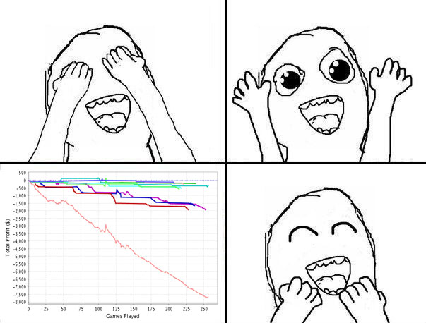 График за последние 350 турниров говорит сам за себя ) тупо 6 сессий подряд с минимальным числом итм и максимальным числом "ПОШЕЛ ТЫ НА ХЕР ИЗ ТУРНИРА , КОЗЕЛ!"