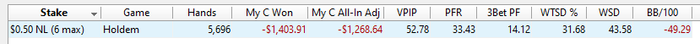 Конечно, с VPIP 52 и нет смысла надеяться на другие результаты, но хочется поучаствовать в максимальном количестве ситуаций, да и у меня все-таки нет цели строить карьеру - с VPIP 20 можно всю жизнь просидеть на NL50, дожидаясь, когда тебе раздадут по чартам.