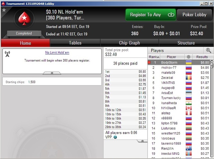И так, понедельник не так плох, как его рисуют)) Начал утреннюю катушку с нескольких отыгранных в минус туриков, но один из турниров за 0,10$ все перекрыл))) Вот он топ1 в СНГ))