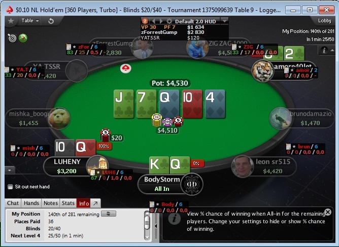 Давно не заходил в свой блог и он оказался на 5 странице форума. Все это время как-то не игралось: то времени не было, то настроения!!! А когда играл, постоянные переезды меня преследовали, что и стало причиной залитого БР на Титане. В течение определенного времени Титан забирал у меня деньги, не раздавал руки. И в тот же день, когда был уничтожен весь БР, титан просто прорвало и мне начали сдавать 80% отличных рук, но это только в турнире от GT, короче говоря ТОП2 и 15 с копейками долларов выиграл. Сегодня начал небольшую сессию на Старзах и на Титане. Начало многообещающее...