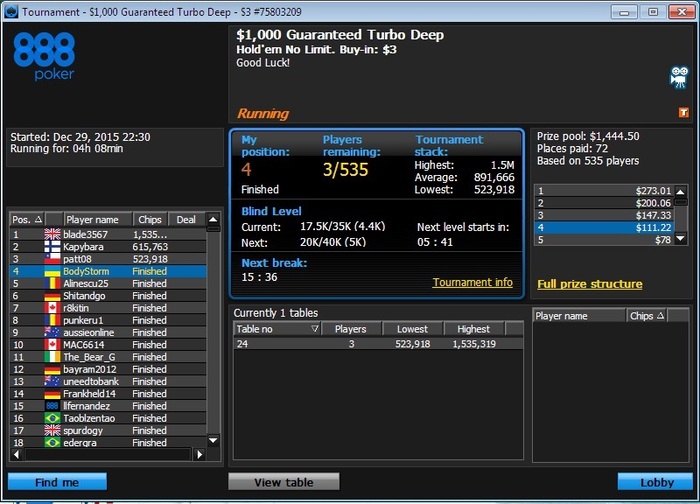 Давно не заглядывал в свой блог, да и желания не было, если честно! Все время сплошные переезды, но и игра моя была не на высоте. Короче, заливал свой копеечный банкролл. Старзы конечно чуток дали мне, но потом забрали больше. Как же мне хотелось подарочек к Новому Году... Вчера решил поиграть на 888, хотя этот рум мне и не нравится (благодаря своему ГСЧ). Вообщем зарегился вчера на 888 в дипе за 3$ и осталось у меня там на счету 1,90$. Ну и катка началась, турнир начинался поздно, а на следующий день на работу. Несмотря на серьезный тильт, я собрался с мыслями и начал играть. Игра началась просто ужасно, спустился до 3 ВВ в самом начале турнира, но потом пару удвоений и я снова в игре. Ладно, весь турнир описывать не буду, просто скрин...