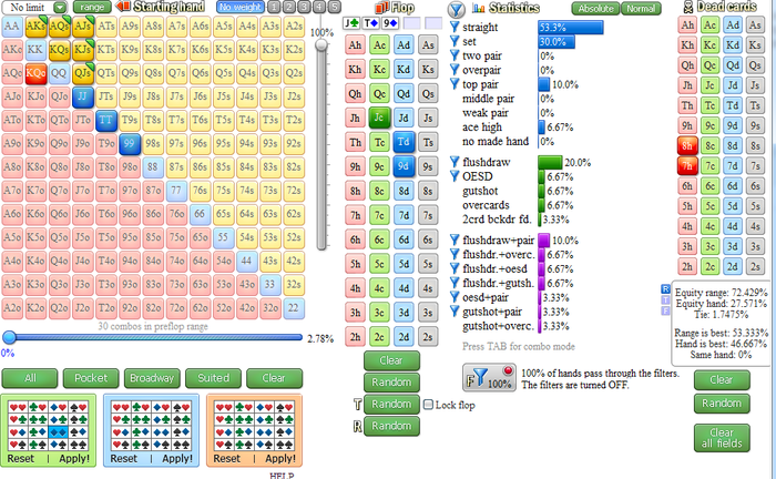 А если я захочу погонять адреналин по крови, то предпочту ставить 3 банки в дипах по 4 флаш доске с 8-хай, чем увидеть там QKh и потерять все надежды на последующее две улицы. Или же увижу монстр дро/сет и вспомню главною заповедь в подобных ситуациях и буду повторять все 1.5 секунды " БЕЗ БУБНЫ И ПОВТОРА... БЕЗ БУБНЫ И ПОВТОРА... БЕЗ БУБ.. ну сука тварь. "
