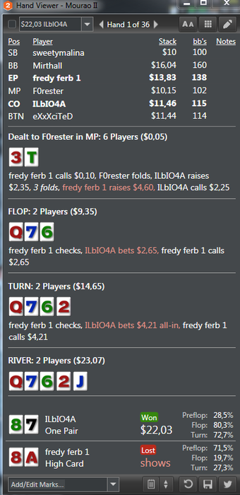 Тут понимал что перекрут в не куда, но подумал мало ли заколит с какой нибудь 7. от увиденной руки - офигел. Не понимаю, если у нас AQ и доска с Q то у противника теоретически остается мало комб с Q, то почему на практике это не работает,д т е оппы постоянно показывают подобные комбы?