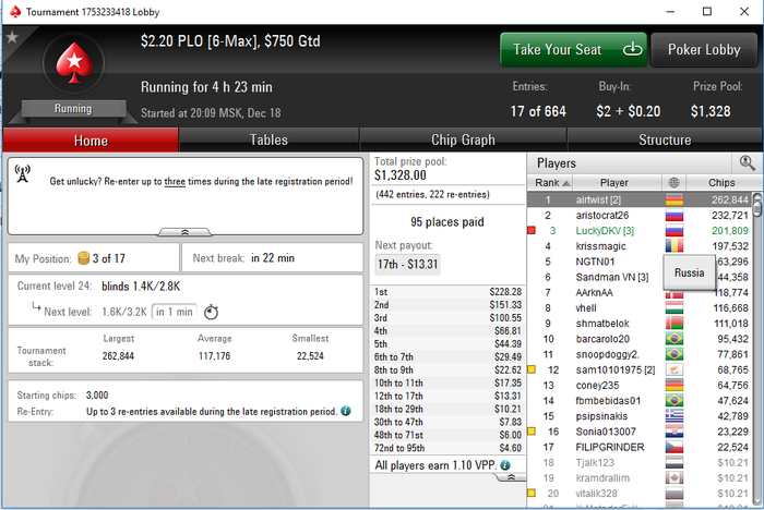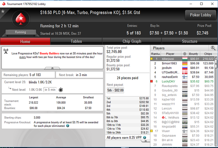 RodriGoPunch @ 27.12.2016 Все хаю хай) с вами иван...))) ну да ладно) с вами Денис) короче катка совсем полна жопа, я походу играть не умею в омаху( либо так сильно деньги давили, что пацан на предфиналке сидел, каждую руку открывал ну и мы с оппом фолдили, поимел он с нас фишек приличное кол-во( Один раз попробовал в него 3бет поставить, а там блайды уже очень большие были у меня стек 15бб, ну он колл конечно, и я мимо доски с сильной рукой сфолдил... осталось малец фишек, этот безумный агромакакен покалечил оппа, сел я за финалку коротким, ну и там и вылетел без шансов( короче итог таков, либо это просто деньги давали или я фиша) скорее всего второе) а ну и вот сам топ6) хоть что-то пусть тут будет)