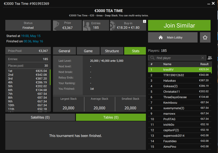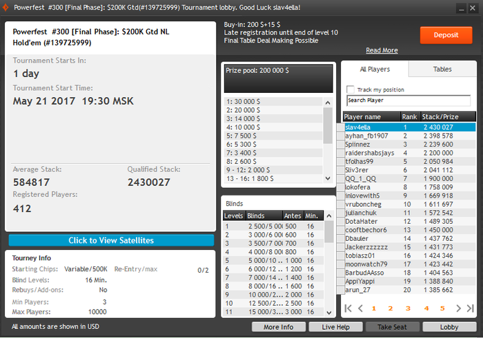 Че как посоны?) Заливаете на скупах\поверфестах\инферно?) Решил присоединиться и, соответственно, депнул на пати, потом еще раз, и еще раз ... ну вы поняли. Но вот только сегодня удалось отбить баины, и даже больше, квалификанулся во второй день фазы с чипстэком) Переапался в нем конечно люто) 2 раза в трибетпотах флешь с флопа в топ сет + устоял оба раза, стритфлешь в 2 пары в трибетпоте и тд) Надеюсь переап перенесется и на вск)