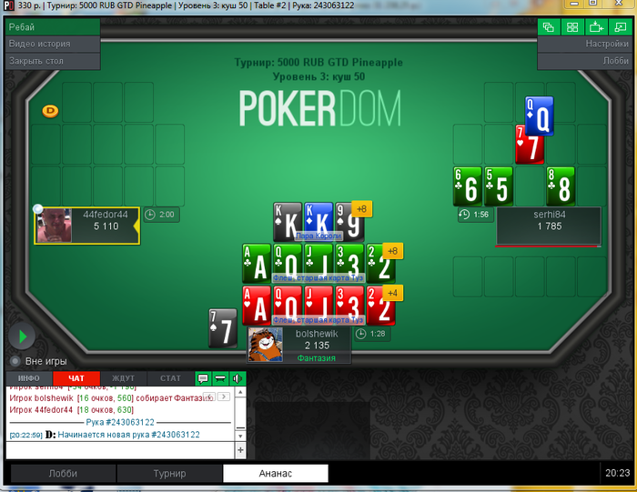 Как только будет хорошая акция на покердоме, конечно, вернусь и может поиграем час-два другой. П.с. 1к раздач не осилю по времени и по терпению. Все таки китайка для меня - это больше развлечение и отвлечение от основных игр. Года 3-4 назад все активно писали и говорили про китай, я думал, будет бум, но увы, это быстро забылось, ажиотаж упал. (точно такая же картина в свое время была с танцем Тектоник, помните тех безумцев, которые на улице махали руками над головой, интересно, где они сейчас? А также с Покемон Го, два месяца ажиотажа и нету больше новостей)