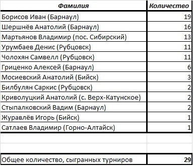 В турнирном рейтинге золото и серебро забрали Барнаульцы: Борисов Иван и Шершнёв Анатолий. От души поздравляем вас!!!