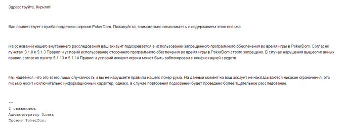 gneva @ 11.4.2017 PokerDomConsult, как так вышло, что мультиаккаунтинг ВНЕЗАПНО был обнаружен вами после верификации аккаунта и нескольких кэшаутов, при том что вы сами разрешили играть "жене" с того же компьютера? Или вы просто закрывали на него глаза до повторного использования софта?