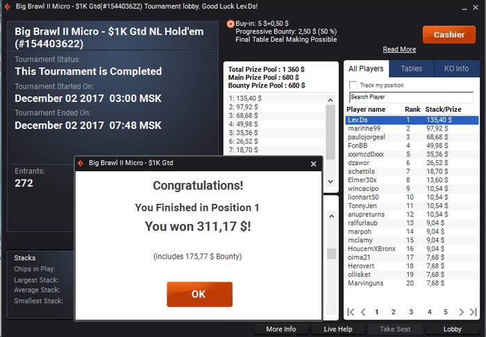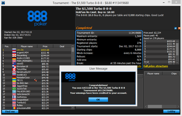 levakov01 @ 28.11.2017 Всем Привет! в покере дела обстоят не очень , но я не расстраиваюсь ищу в чем проблема жду и верю что скоро будут крупные заносы Всем фарту за столами !