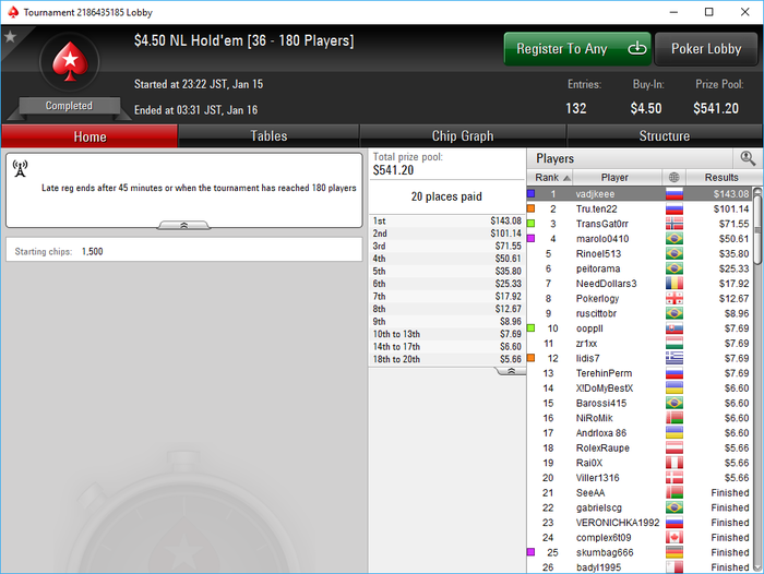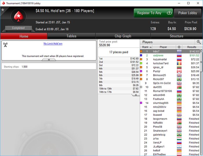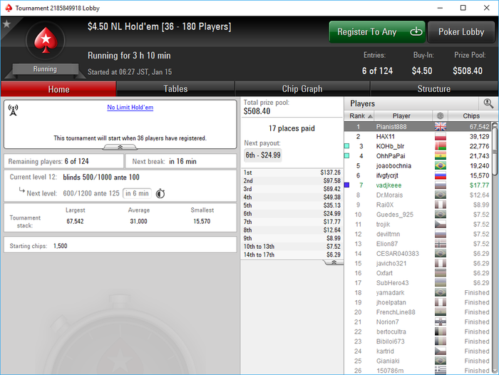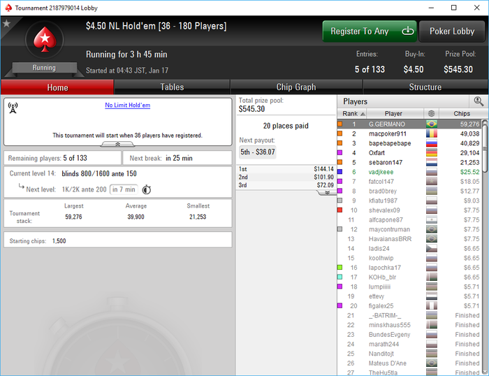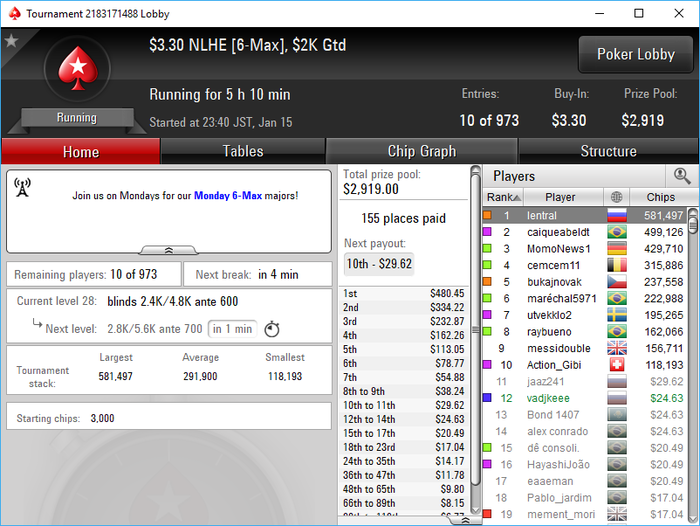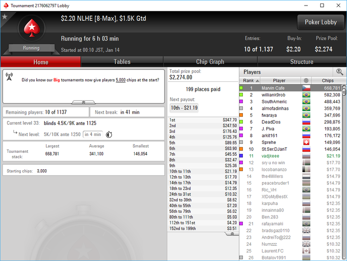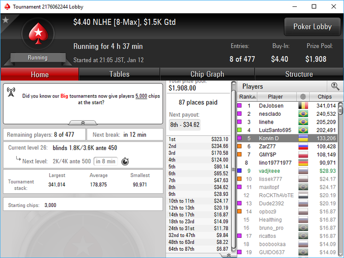 Poker Stars, $5 Buy-in (1,400/2,800 blinds, 280 ante) No Limit Hold'em Tournament, 9 Players
