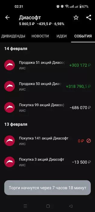 Февраль в плане торговли был сложным, изматывающим. В первый же или второй день месяца ушёл в -3%, после этого полторы недели торговал минимум часа по 3 в день, в итоге вывел месяц в примерно +3%. 13 числа запустили торги акциями Диасофт. В первый день из планки купить не удалось, зато налили по полной на аукционе открытия 14 числа и сразу на старте торгов открылись в минус. По итогу за месяц как раз на эту сумму и в минусе.