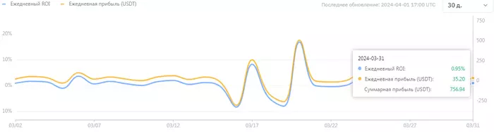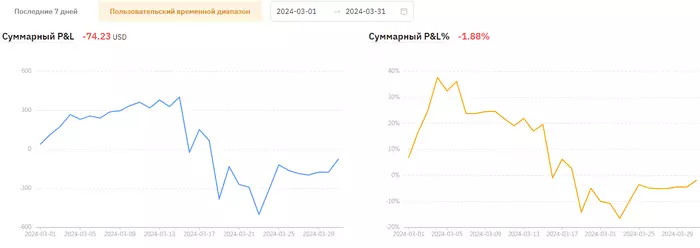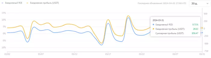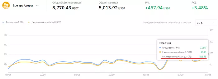 Статистика показывает +$807, возврат комиссии за месяц где-то еще долларов +/-50, итого примерно +860$ за 30 дней. От какого капитала считать сложно сказать, т.к. по ходу месяца докидывал, плюс с утра несколько сотен долларов выводил для ручной торговли, на ночь обратно кидал их в копитрейдинг, т.е. баланс постоянно менялся, но думаю, вряд ли средняя будет больше 3500-3600$. Получается доходность в районе 24%. Это гораздо лучше, чем ожидал. Но нужно сделать скидку на рынок. 200$ из этих 800$ были сделаны в день, когда биткоин с 53 до 64 вырос - 28.02.24. Да и в целом весь месяц рынок почти безоткатно рос, поэтому не стоит сильно радоваться такой доходности.