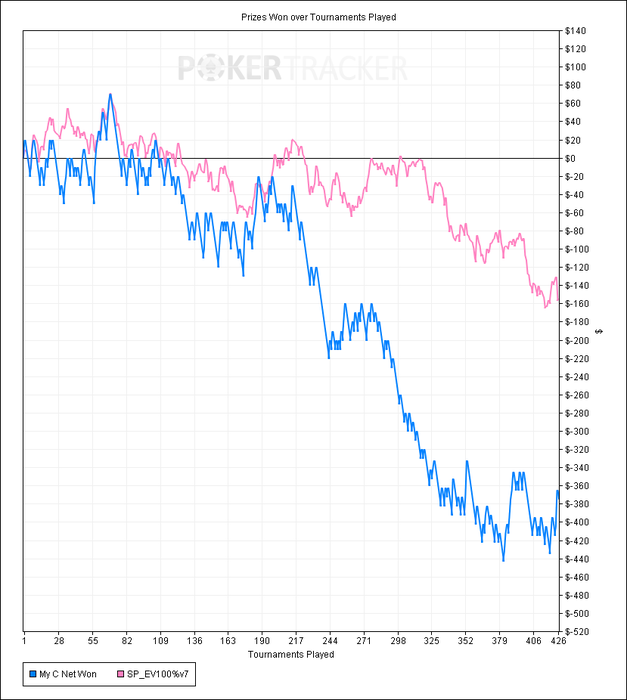 Не смотрел результаты целый месяц, играть было очень комфортно и приятно. Прогрузил сейчас то, что наиграл за этот период. Сначала расстроился, а потом еще немного расстроился. Ожидал получше графика. Посмотрел по лимитам результаты. Оказалось, что это мой график так косоёбит и по EV и по реалу в основном из-за шотоваемого лимита (10$). Расстройство почти сошло на нет. За 426 турниров проиграл на десятках по EV 15 байинов, по факту около 40 байинов ливанул. В принципе, типично раздают для нового лимита, ничего нового и страшного. На пятерках всё довольно плавно выглядит.