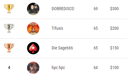 Лидерборды не пошли в этом месяце. Два приза там получил – 12.5$ и 37.5$. Вот в том, в котором дали 37.5$ опять был реальный шанс взять топ-1. Очков для этого в тот день нужно было поменьше, чем обычно. И моих даже хватало, чтобы за пару часов до конца лидерборда быть в топ-3, но в последний момент всё же подвинули. Если бы в двух последних турнирах (x3 вроде) не проиграл в hu фишам, выставившись 80 на 20 на весь стек, то должно было хватать.