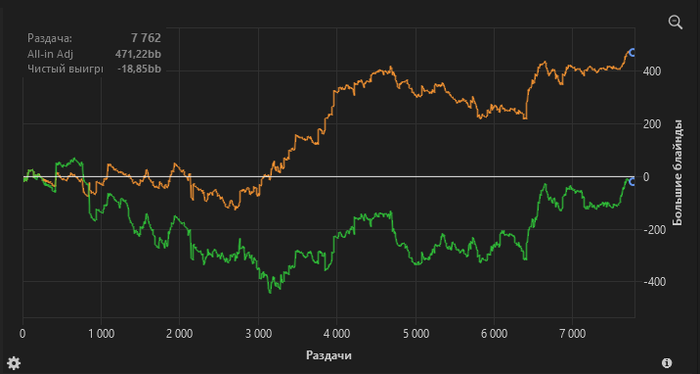 Если есть тренер, то ладно. Но я по одному графику чипЕВ могу поставить несколько диагнозов и дать пару советов. Чем короче турнир, тем важнее твоя игра в ИСМ-стадии и в ХА. Просто иметь 5 бб/100 и играть в нормальный плюс не получится. В МТТ можно в общих чертах понимать, где нужно сужать/расширять диапазоны, и показывать при этом хорошие результаты. МТТСНГ на 90-180 человек - уже сложнее. Бить 18мах без хорошего ИСМ невозможно. в 9мах и 6мах будет совсем плохо. Как работать над ИСМ. Проще всего заливать все руки с финального стола в ИСМайзер, смотреть что он посчитал. Это позволит быстро найти повторяющиеся ошибки и определить направления, над которыми нужно работать. Нужно много разбирать споты, которые попадаются в игре. Нужно делать это после каждой сессии, а не раз в неделю, например. Если винрет в ХА низкий, нужно срочно работать на этим аспектом, потому что короткие турниры важно выигрывать. На вторых местах далеко не уедешь. ВР в ХА желательно, чтобы был выше общего. 5+, я думаю, хотя бы должен быть. Нужно разделять стадии турнира. Начало, ФС, бабл. Контролировать, чтобы ВР везде был приемлемым, а не просто смотреть на общий Удачи.