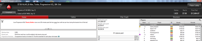 DVS, Привет. Пати пока тяжело идет, за 400 игр небольшой минус. Фишей вроде прибавилось, но играть без статов мне сложно. Поэтому гружу меньше на пати. Вчера вот был выстрел топ 3, еще был в дипе(около 750 за 1 место, но смог в одной раздаче сыграть как отбитый фиш и отдать 50 бб (аут 18)