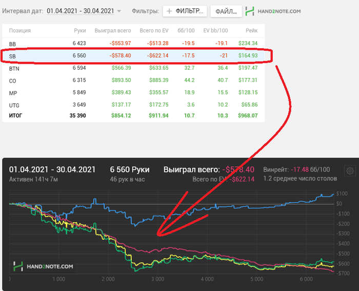 Также посмотрев базу за этот год понял что много лью на позиции SB. лузрейт был более -30 бб/100. Немного пересмотрев теорию игры на SВ поднятул её, это заметно видно на графике ниже.