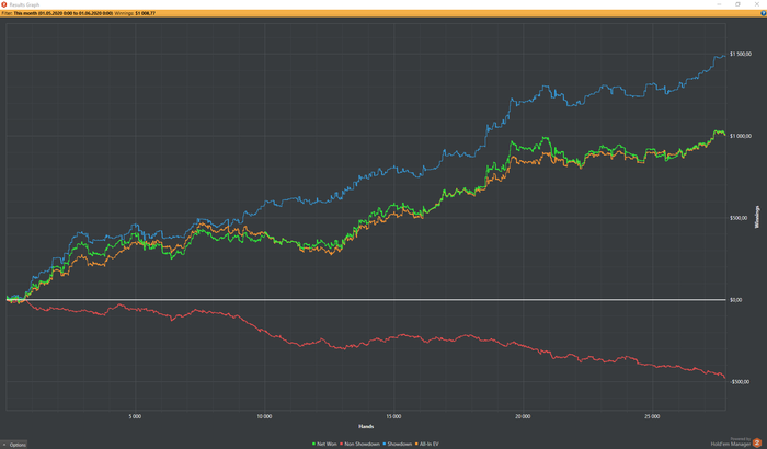 По факту говнорумы съели 50% профита, поэтому после того как я затащил 1.1к$ в апреле ощутил неплохой такой эмоциональный спад. Основной причиной считаю не «стрик, диспа, несправедливость», а то, что я в этом месяце забил на раздачи. Да, я много смотрел обучающих водов во время перерыва, но у меня всего 10 разобранных раздач в ФЗ. Отсутствие дисциплины, нацеленность на результаты дали мне пиздюлей. Где-то в широких ренжах я начал опираться на агрессию, и на просадки в статах, итоге получилось что-то типа того: