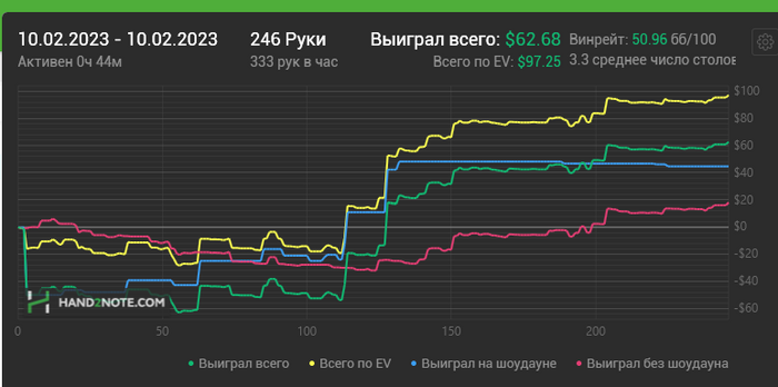 Играю 4 дня подряд 8 столов с агрессивными 70бб/100 фишами в минус. Посоветовал недавно как вести себя в даунстрике в соседнем блоге, так сразу у меня началась подобная полоса. Тут ещё и первый депозит в рум занёс, короче даунстрик в квадрате.
