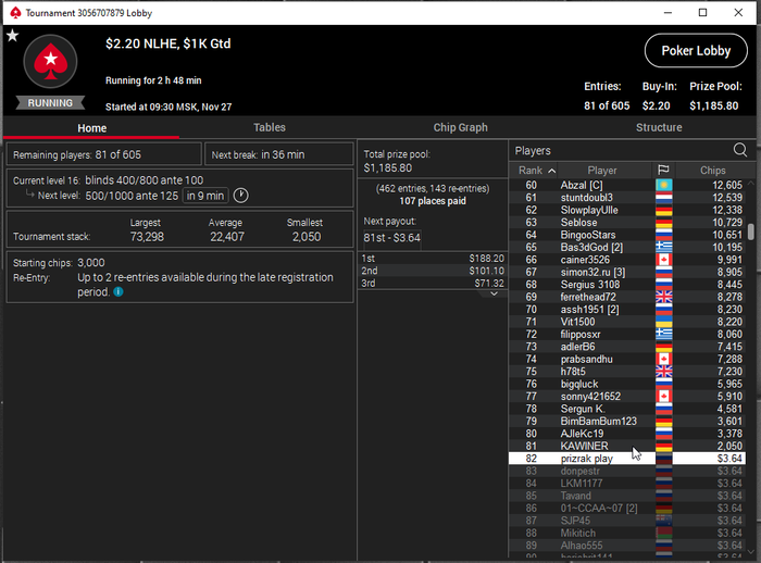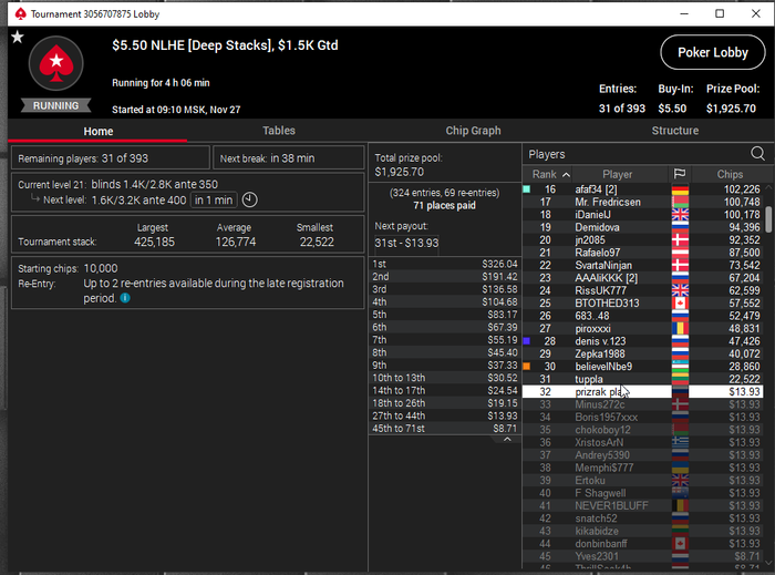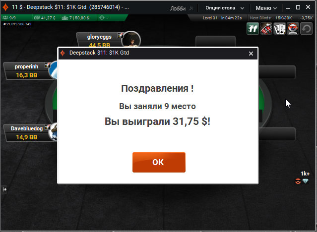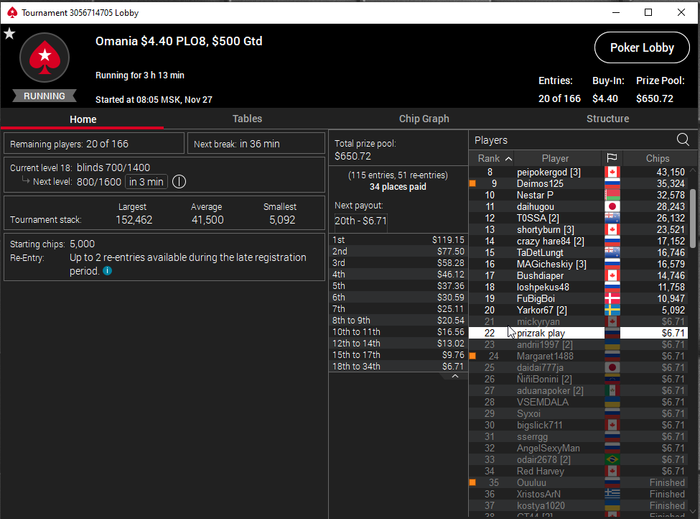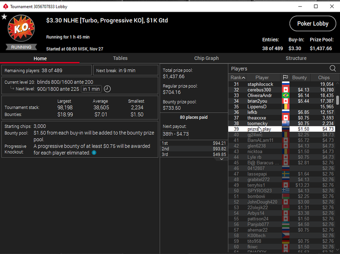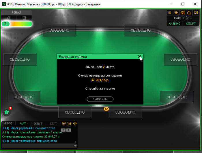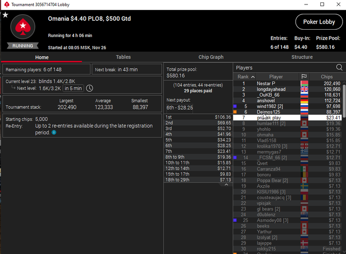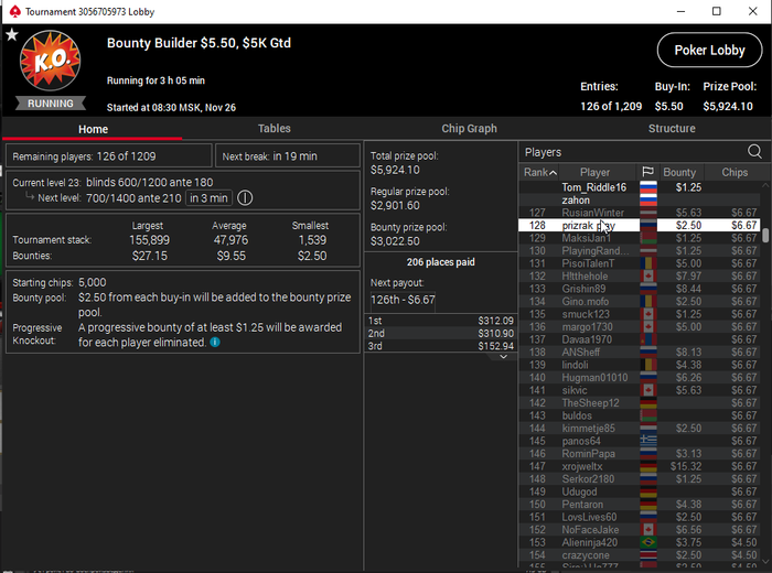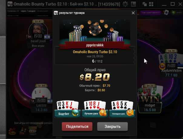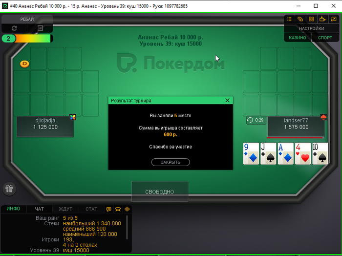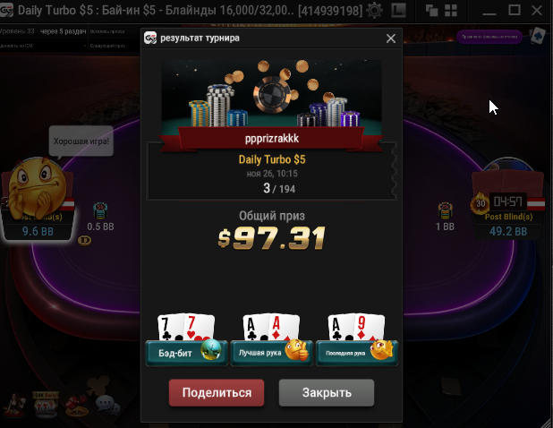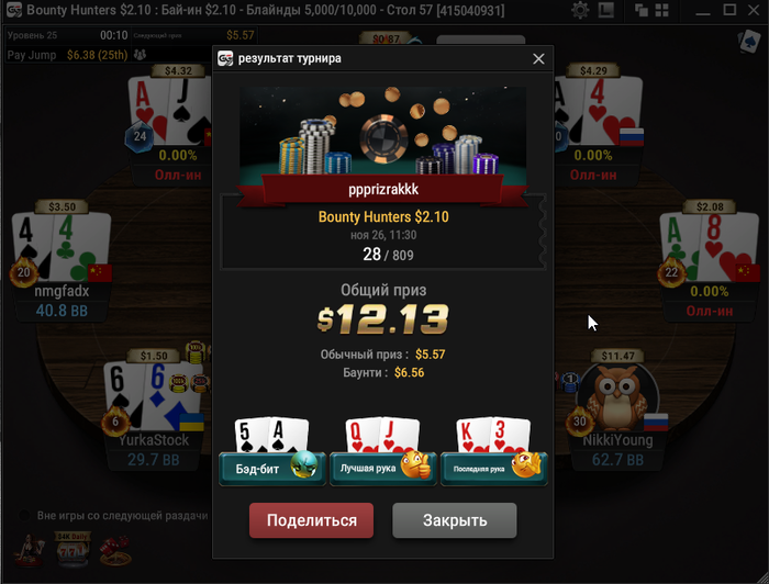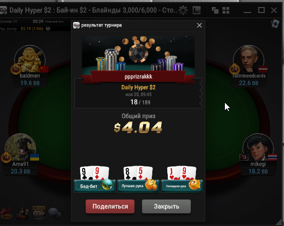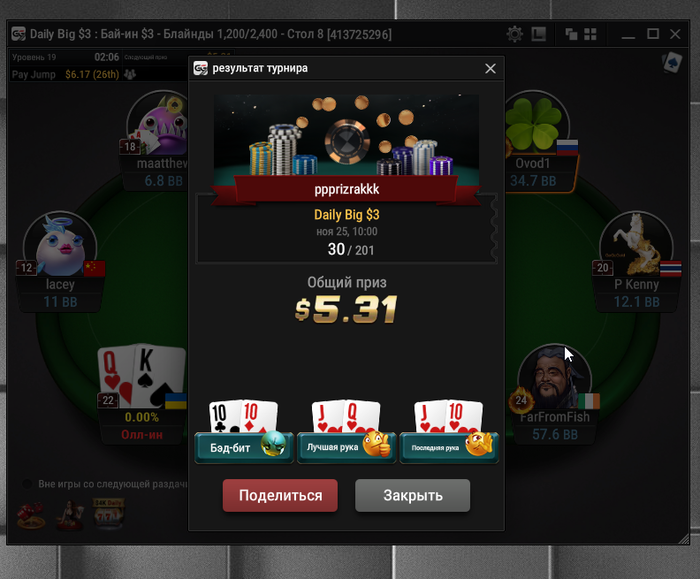 В конце турика осталось 4 человека и когда стеки стали примерно равные я предложил поделить и все с радостью согласились) Время было 5.30 по МСК. Итого сессия +430$. Бр 5382$
