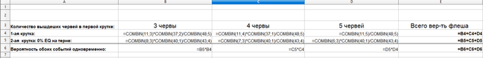 Для каждого из этих случаев вероятность готового флеша к терну во второй крутке разная из-за количества оставшихся черв в колоде. Вероятности этих событий умножить на верояность готового флеша во второй крутке к терну в каждом из них. Сложить эти вероятности. Навскидку вероятность в районе 0,01-0,02%. Хочу заметить, что вероятность тут заметно меньше, чем проиграть 2 раза подряд в независимых друг от друга раздачах из-за того, что тратятся ауты в первой крутке.