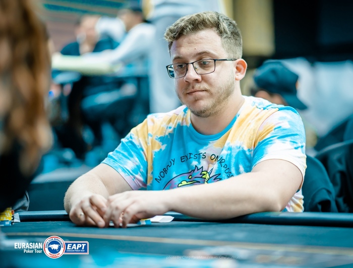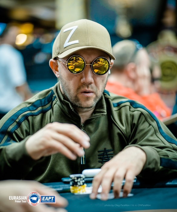 Гия открыл 2,500 с баттона, Евгений Шикунов защитил большой блайнд. Флоп прочекали. На тёрне Евгений сыграл чек-колл 4,000 и донкнул 4,000 на ривере . Гия перекрутил до 10,500, Евгений не выкинул трипс.