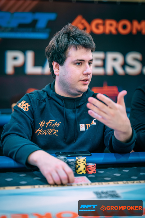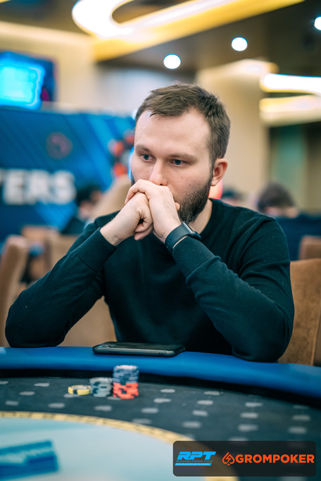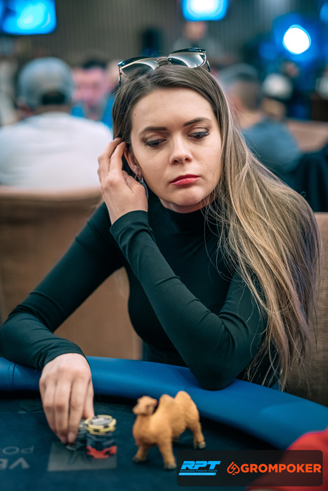 Валерий Фокин оупен из ранней 5,000, следом два колла от Елены Тарасенко (СО) и Артема Сергеева (ББ). По выходу с-бет от Фокина 6,500, на что Тарасенко ответила плоским рейзом 12,000. Сергеев Макнул, а Валерий объявил оллин, который Елена и закрыла.