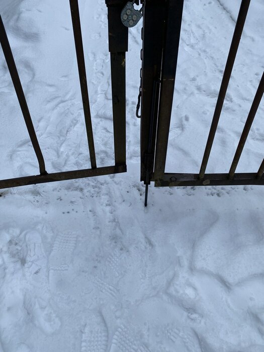А сейчас мы ходили погулять после моей сессии, и там были странные следы, которые вели в лес, через поваленный забор, который кто-то повалил и камнями прижал, чтобы можно было проходить. Через лес тут дорога в другую деревню. А около ворот кто-то топтался и вероятно пытался сорвать замок, или открыть. Замок кодовый, и там все цифры перепутаны были, пытались подобрать походу.