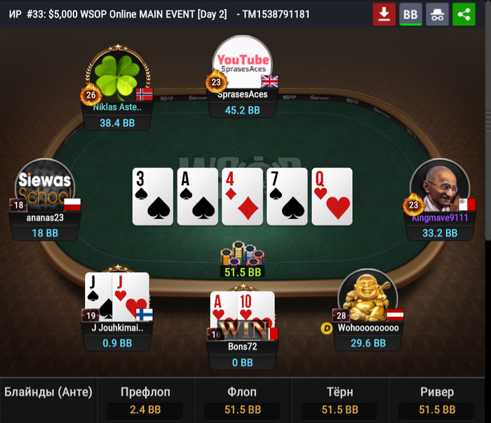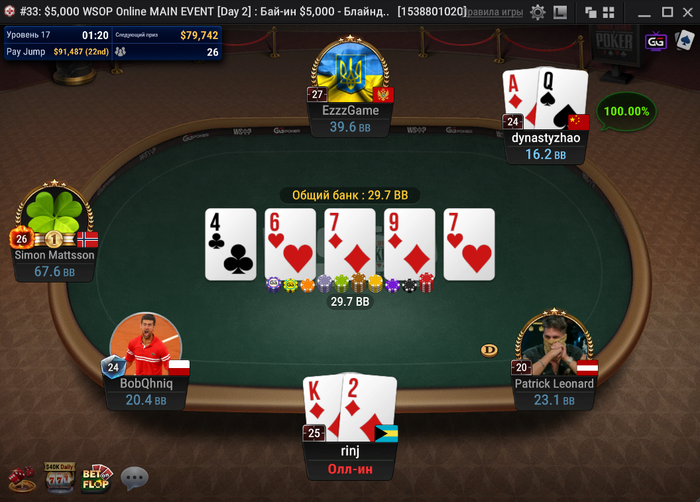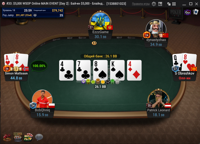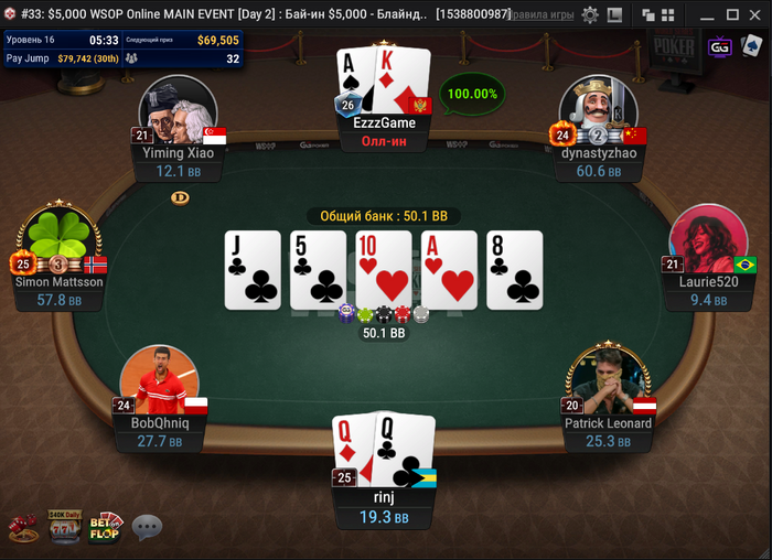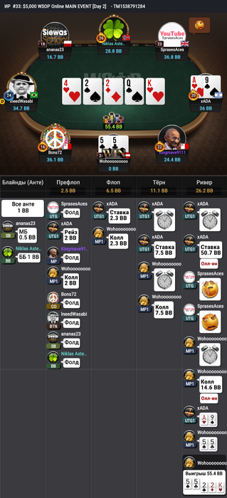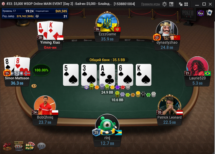 За другим столом было близко к тройному олл-ину, но поехали только двое. Рейз с первой от dynastyzhao, колл на баттоне от Маттссона, недопуш Имина Сяо, 4-бет dynastyzhao и 5-бет пуш Маттссона! Китаец всё-таки выкинул.