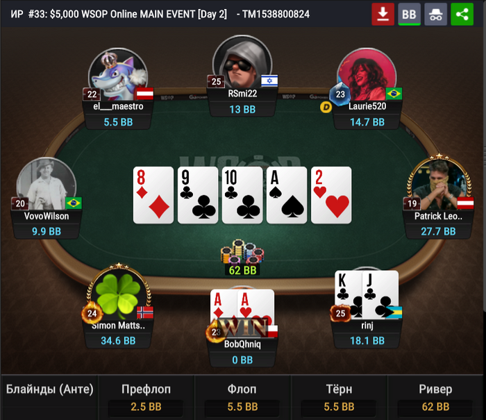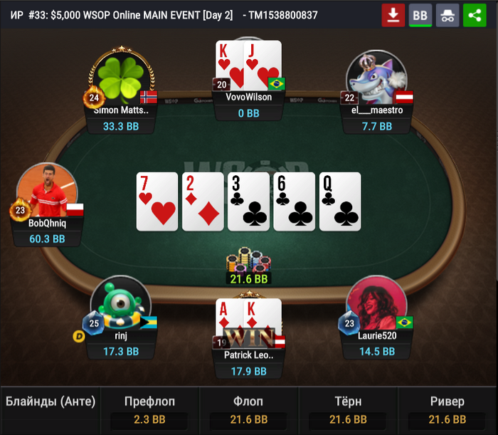 После прочеканного флопа BobQhniq поставил 4bb на тёрне, а в ответ ему прилетел чек-пуш. Последовал колл, и BobQhniq устоял против дров, став чиплидером.